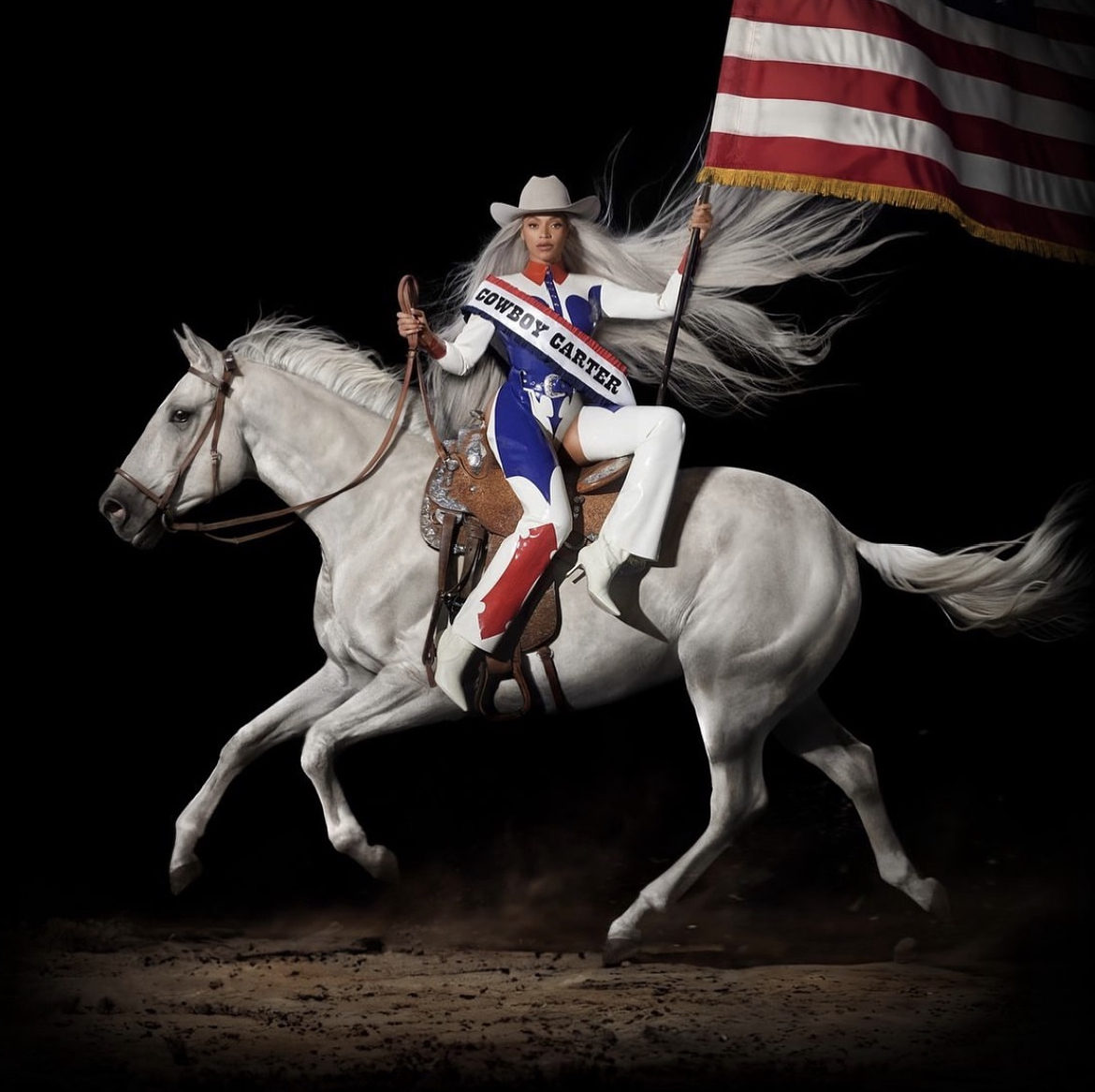 Showcasing her Houston, Texas roots, Bey posed on top of a white horse in a patriotic and western inspired red, white, and blue latex cowboy look that was paired with matching chaps, and made her look like a true equestrian.