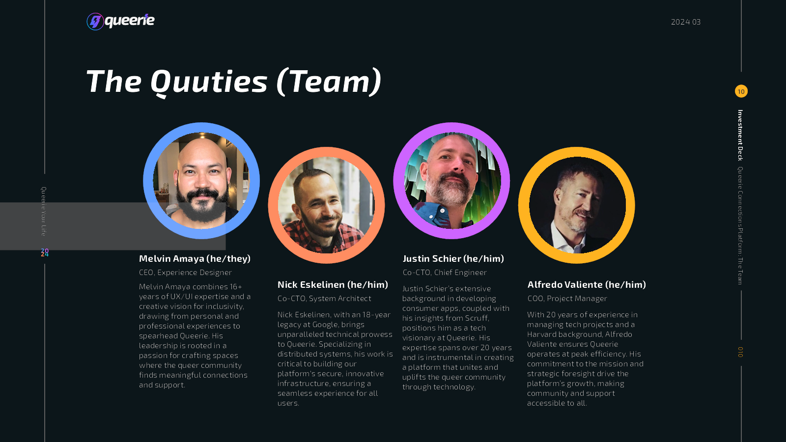 If you’re trying to make the world a better place, you’re probably going to attract mission-aligned investors. So why not spell out your mission front and center? It’s a powerful storytelling technique that’s well executed in the Queerie deck.