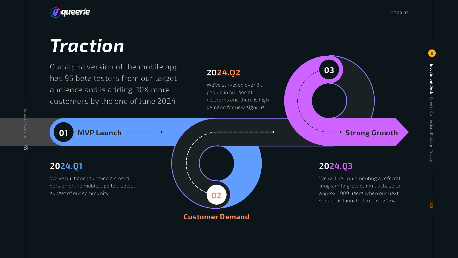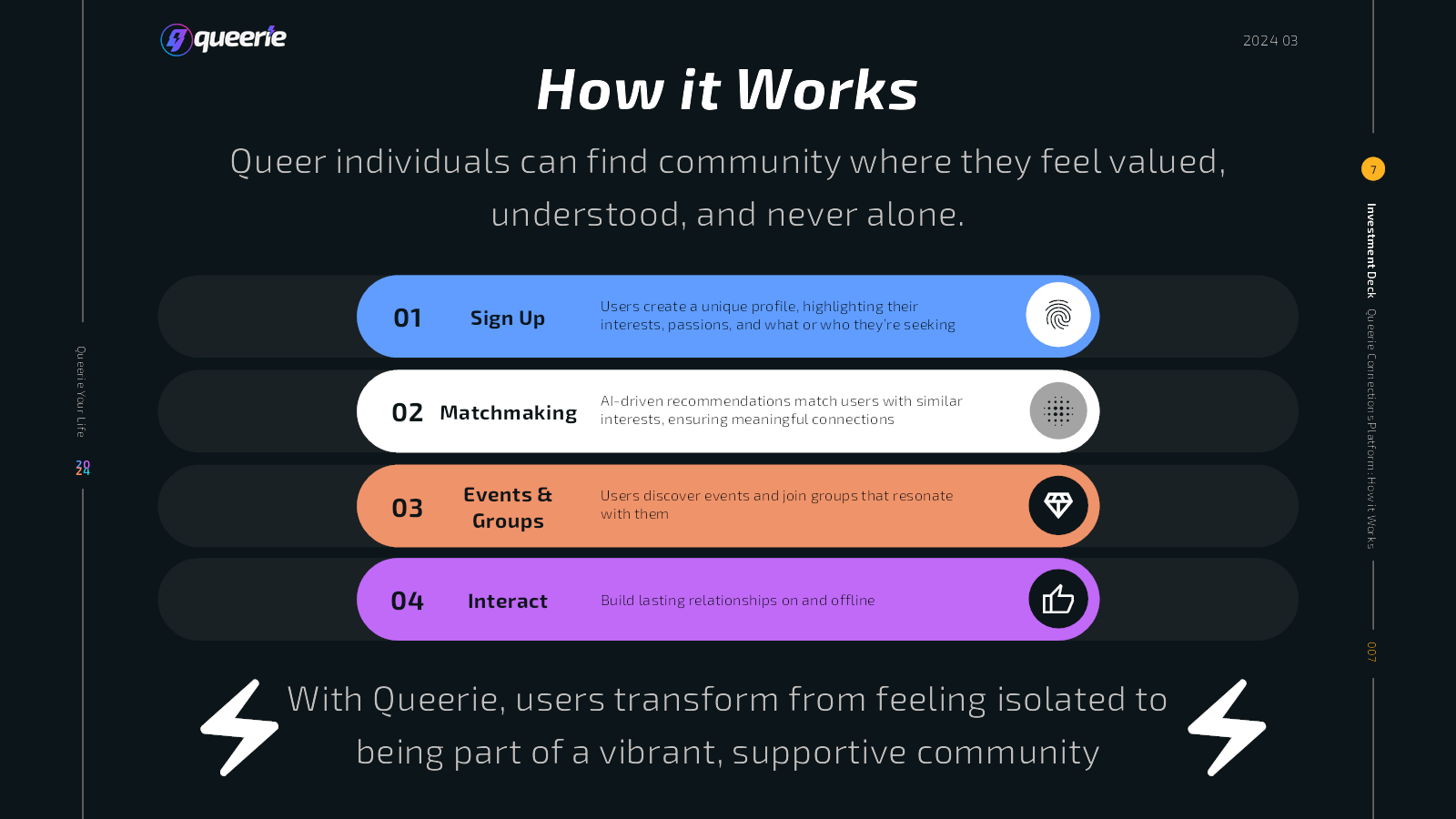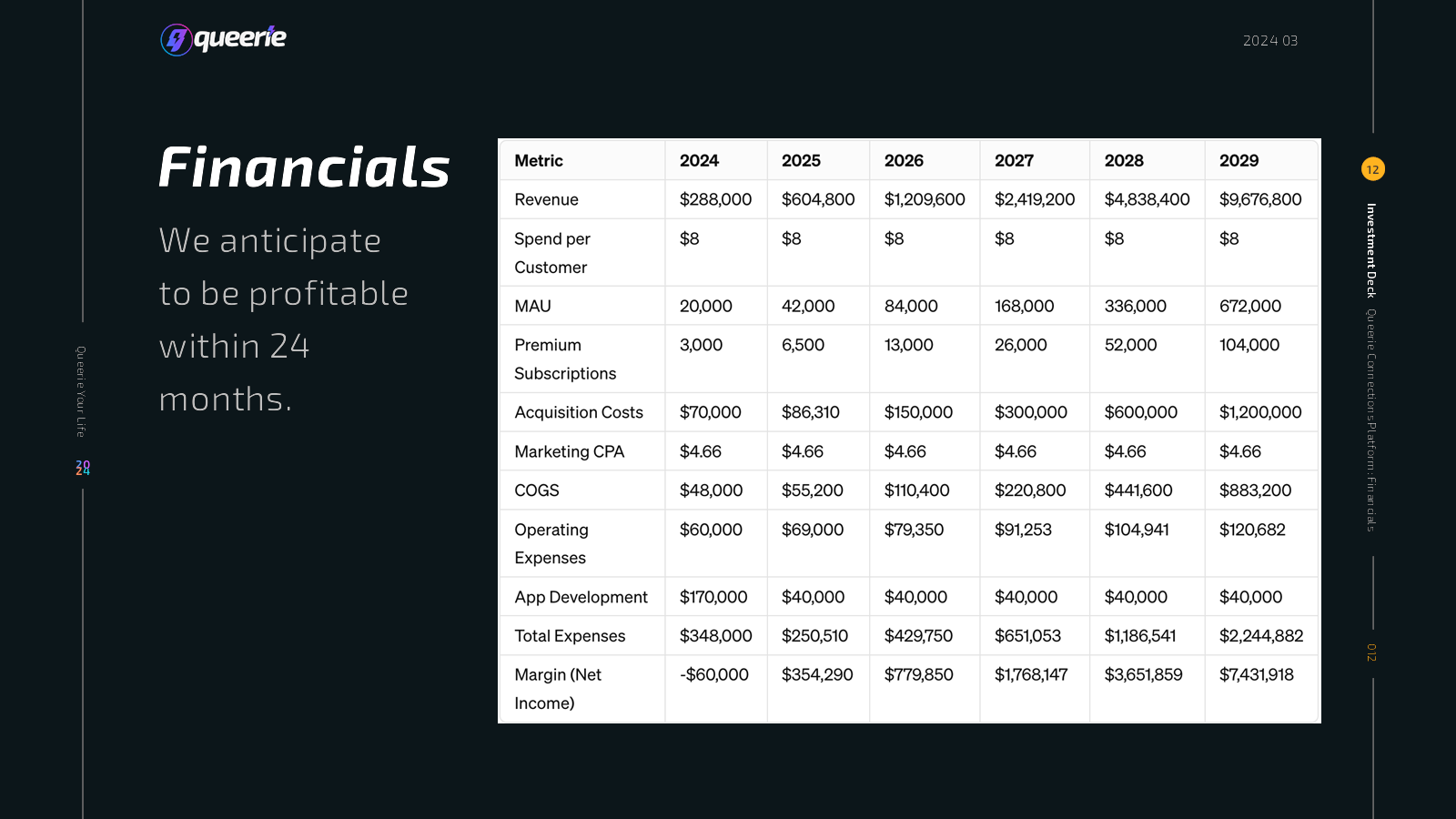 This slide is a bit of a waste. It doesn’t show any of the secret sauce for why Queerie is going to be successful where others have failed; there’s nothing new or innovative here.