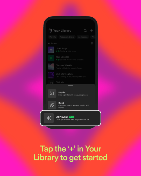 The feature is found in the “Your Library” tab in Spotify’s app by tapping on the plus button (+) at the top right of the screen. A pop-up menu appears showing the AI Playlist as a new option alongside the existing “Playlist” and “Blend” options.