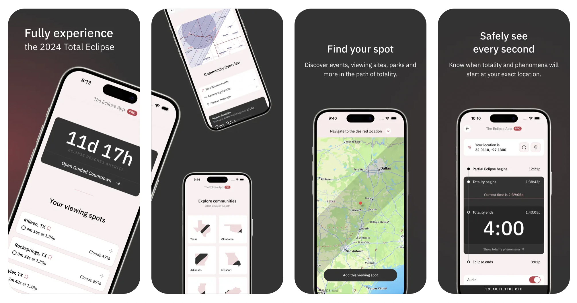 A well-designed app made to optimize your viewing of the total solar eclipse on Tuesday has surged to the top of the App Store. With 140,000+ lifetime downloads across iOS and Android, a simply named The Eclipse App offers a complementary experience for viewing the astronomical event, including cloud cover forecasts, guides that pinpoint when totality will occur at your exact location, and information about local events, parks and viewing sites in your area.