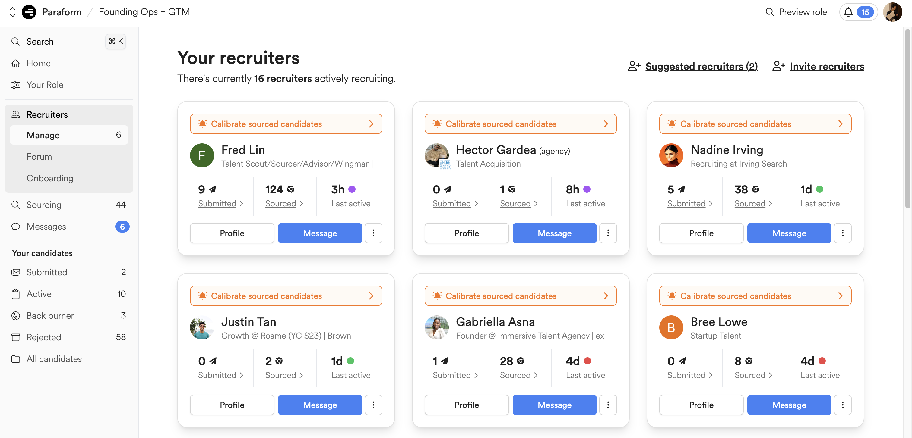 A screenshot of Paraform’s recruiter management screen. Image Credits: Paraform