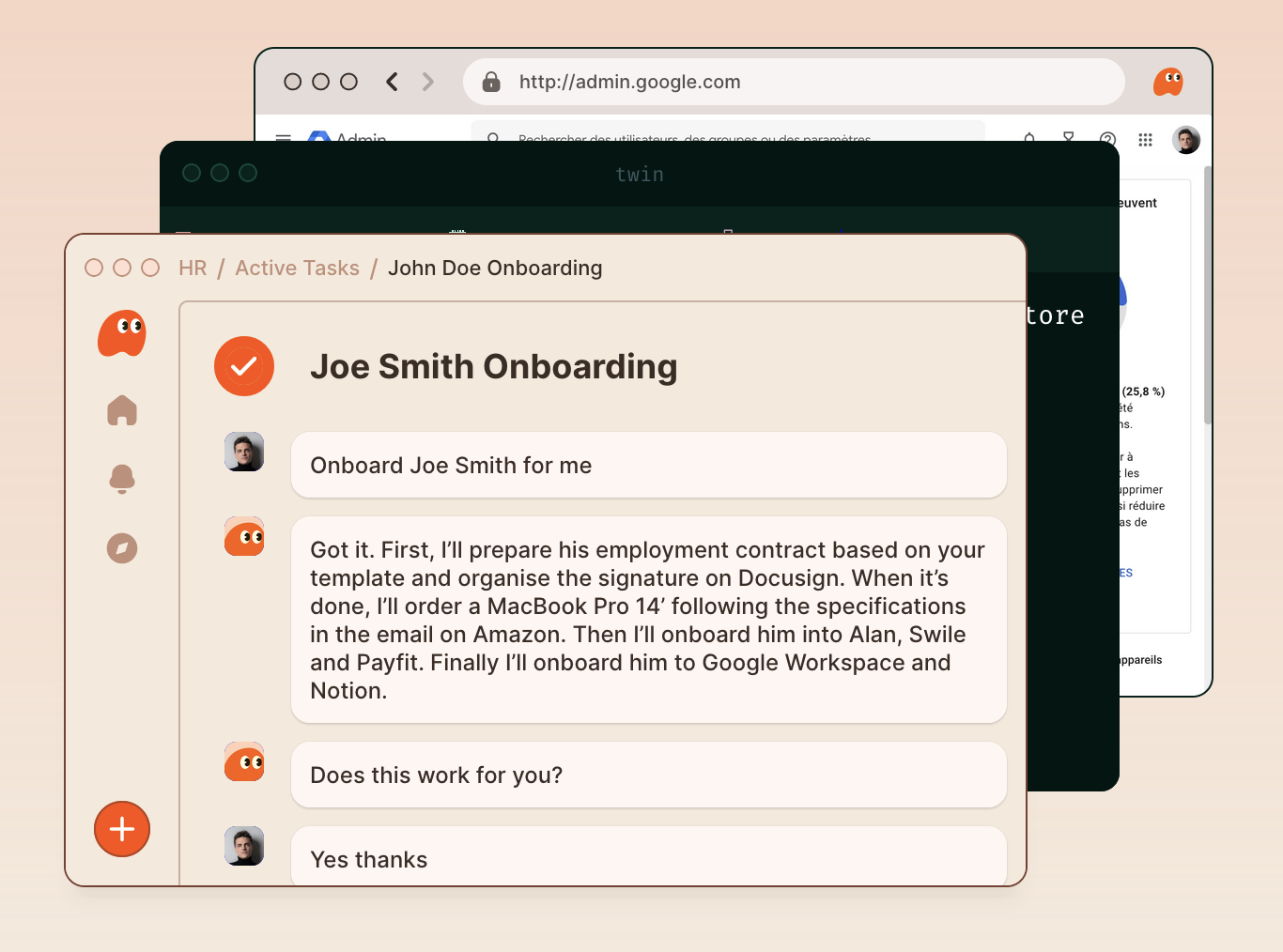 So instead of having a backend engineer build a custom script to do a certain task, you can demonstrate or describe in ordinary language. Stuff like “put all the resumés we got today in a folder in Dropbox and rename them after the applicant, then DM me the share link in Slack.” And once you’ve tweaked that workflow (“Oops, this time add the application date to the file names”) it can just be the new way that process works. Automate the 20% of tasks that take up 80% of our time is the company’s goal — whether it can do so affordably is probably the real question. (Twin declined to elaborate on the nature of their model and training process.)
