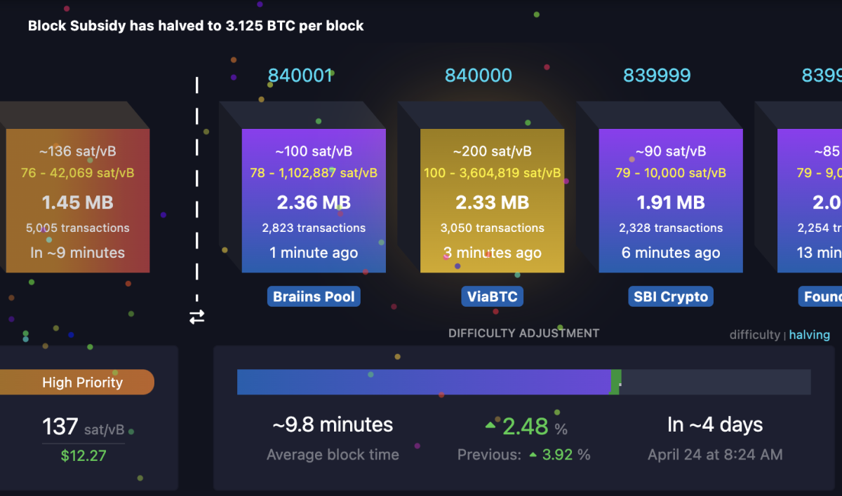 Today, Bitcoin mining pool ViaBTC has officially mined block 840,000, which not only ushers in the fourth Bitcoin halving, but also includes what has been deemed an “epic sat” by the Ordinals numbering system, which is the first satoshi (smallest unit of a bitcoin) of each halving epoch.