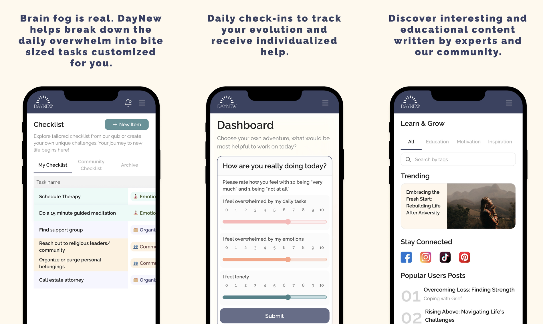 DayNew offers various other features to assist users throughout their journey, including personalized lists for users to check off overwhelming tasks (sell assets, get life insurance, apply for widow social security benefits, and so on) at their own pace, a ChatGPT-powered AI tool that provides emotional advice, and a “Learn & Grow” page with educational and motivational content.