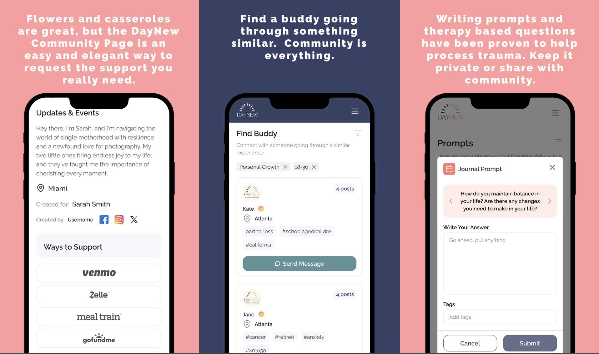 Now available on the App Store, Google Play Store, and the web, DayNew is a new grief support platform, social community, educational hub, and task manager app wrapped up into one, user-friendly package. At its core, DayNew aims to be a safe space for users to connect with others, share their stories, and receive support from the community.