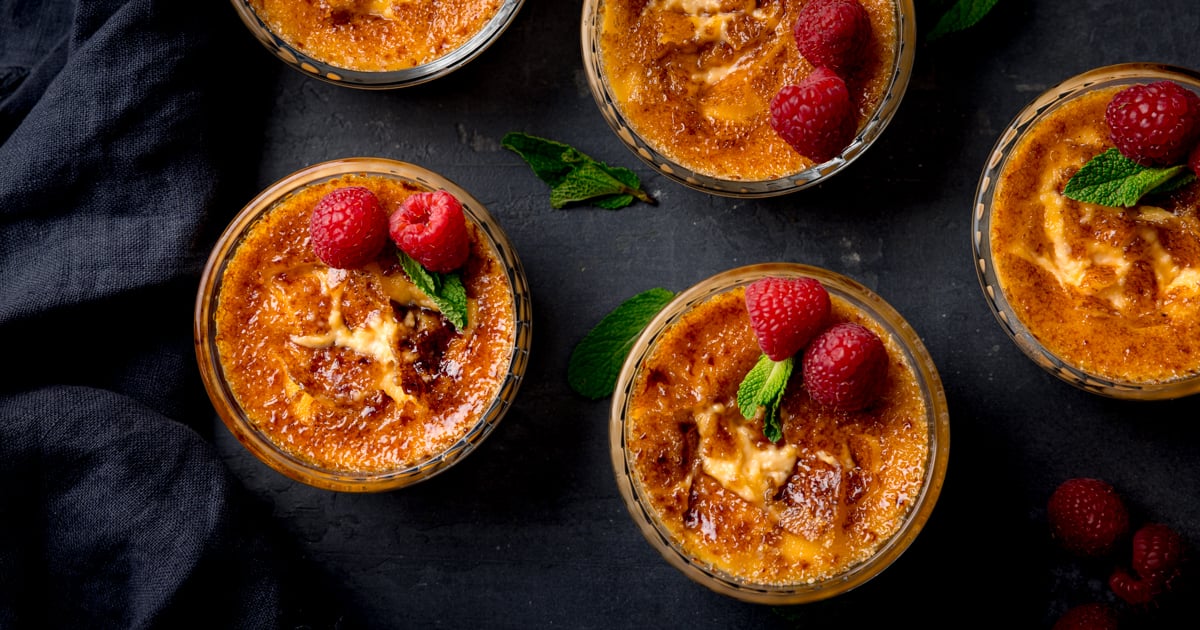 When adding the sugar, tilt the ramekins to ensure an even coverage of sugar before using the blow torch to caramelise.