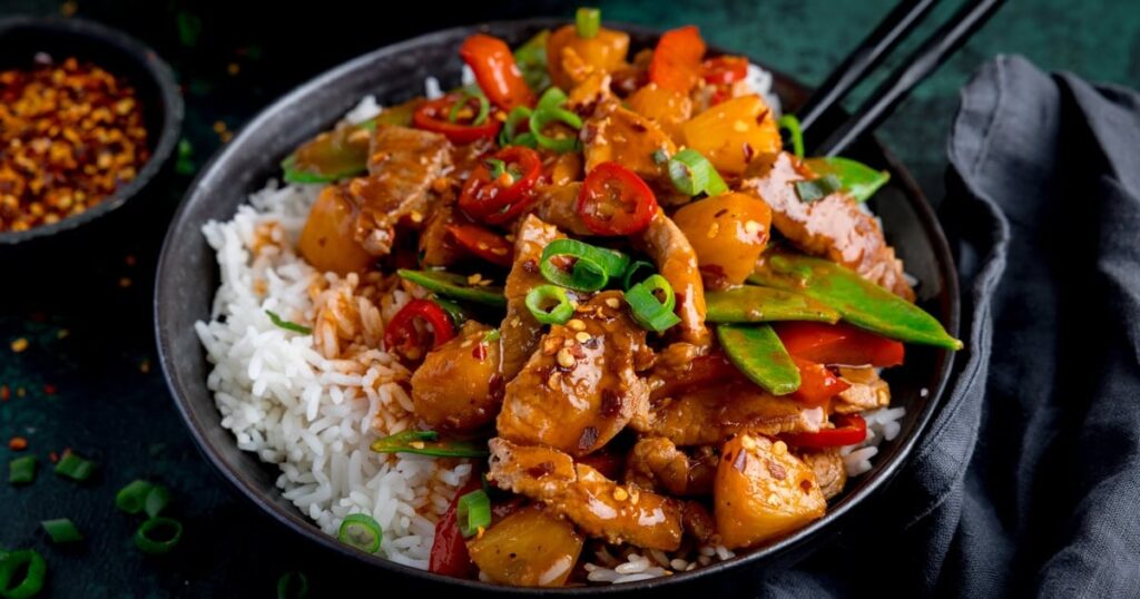 Stir together a quick stir fry sauce and set it aside. In a hot wok, sear tender pork strips, then toss through garlic, ginger, mangetout, red pepper, fresh chilli and pineapple just until vibrant and crisp. Pour in the sauce to bubble into a glossy coat, then serve straight away with rice or noodles, topped with spring onions and a pinch of chilli flakes.