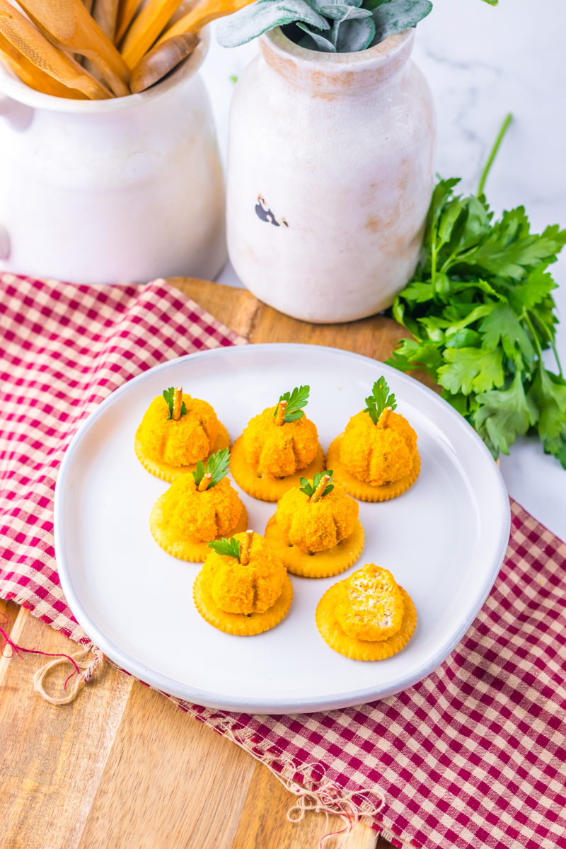 Right before serving, stick half a pretzel stick in the top of each cheese ball for a “stem,” and add a little parsley leaf for a cute pumpkin-y touch.