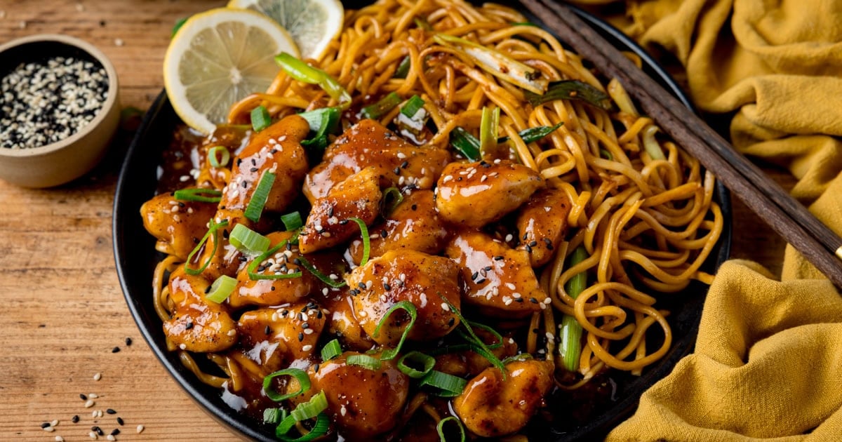 A warming takeout-style meal of chicken breast pieces with a light crispy coating smothered in a tangy lemon and black pepper sauce. Served up with stir fried noodles.