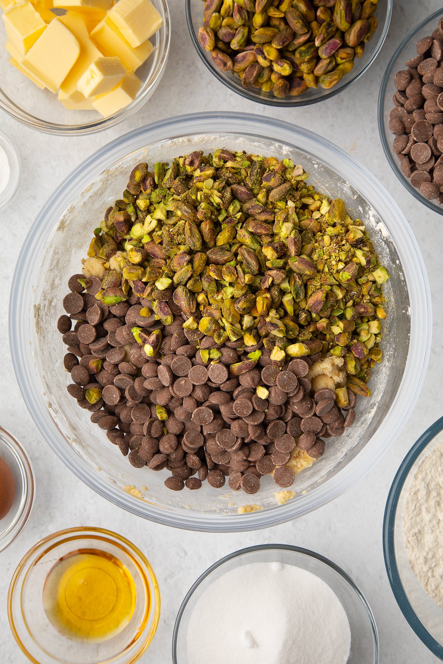 Add the milk chocolate chips and pistachios.
