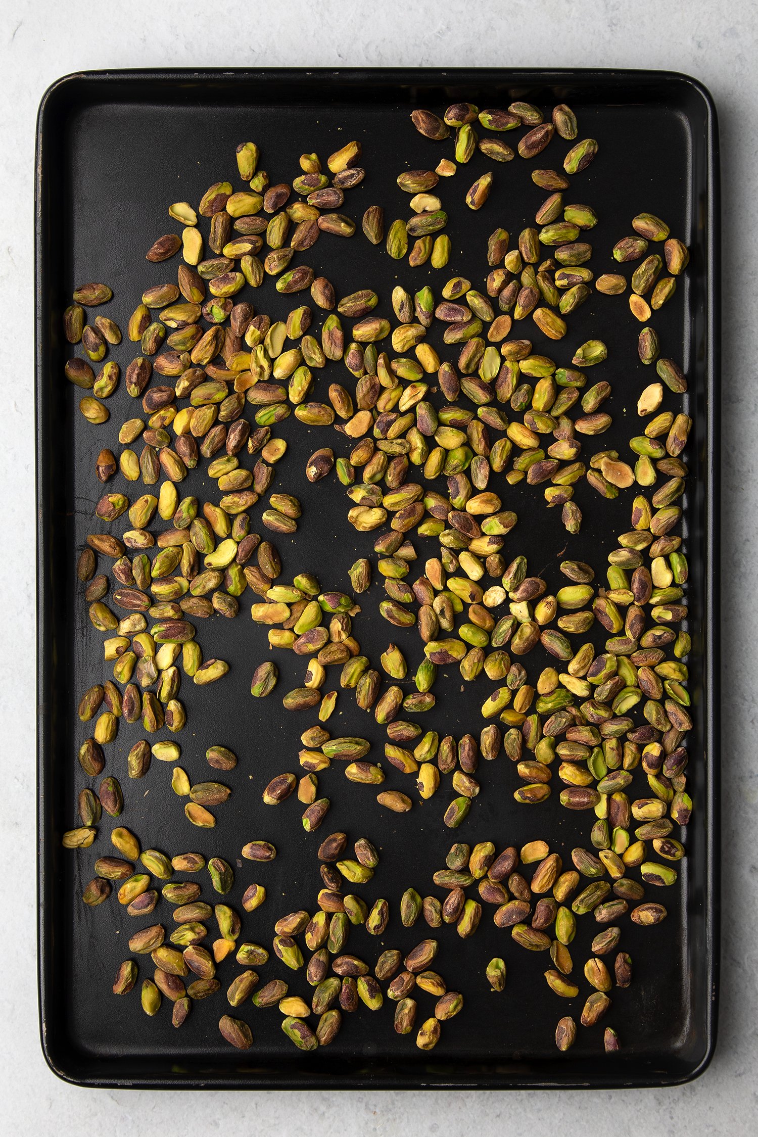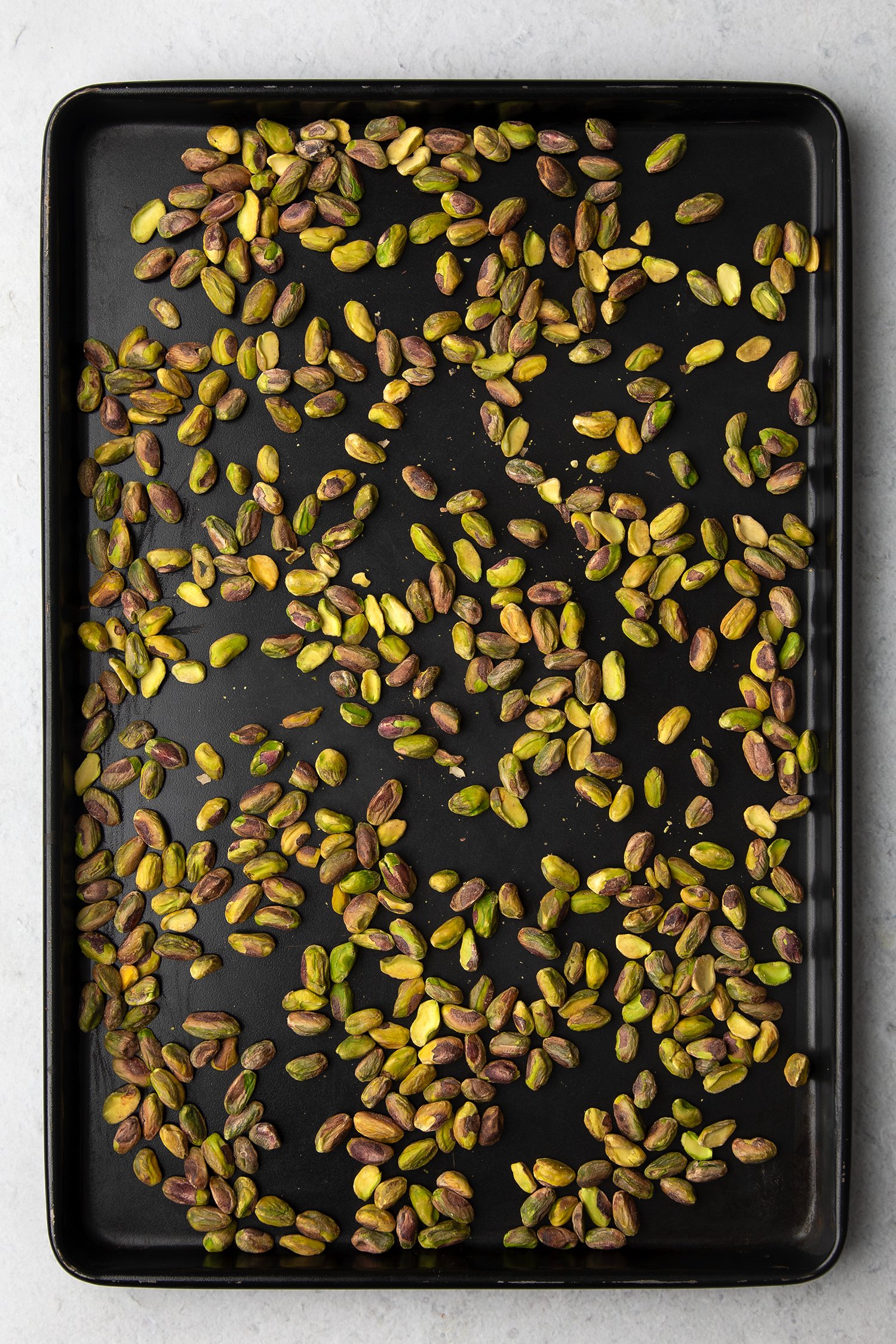 Spread the pistachios on a tray.