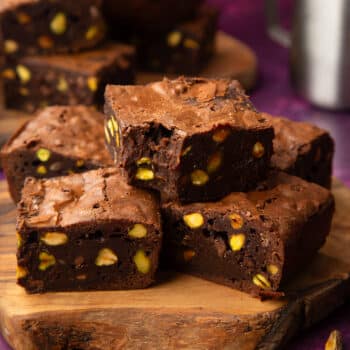 These pistachio brownies are dense, rich and deeply chocolatey, with a crackly top and fudgy middle studded with toasted pistachios and milk chocolate chips.