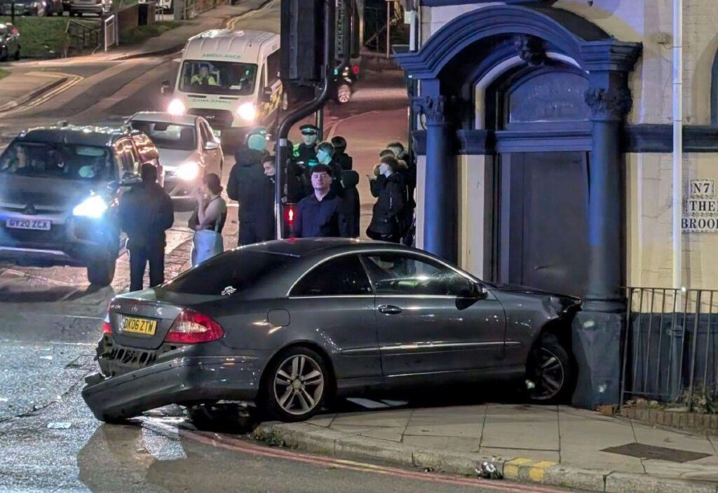 A dark blue Mercedes-Benz mounted the pavement at the junction of The Brook and Whiffens Avenue and crashed into the former Churchills pub, which is now flats.