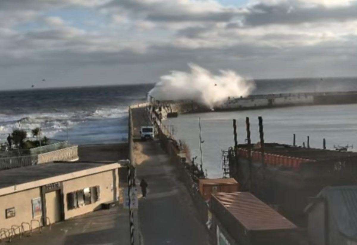 A live video stream has captured footage of huge waves crashing over Ramsgate Harbour Arm this afternoon at around 1.30pm.