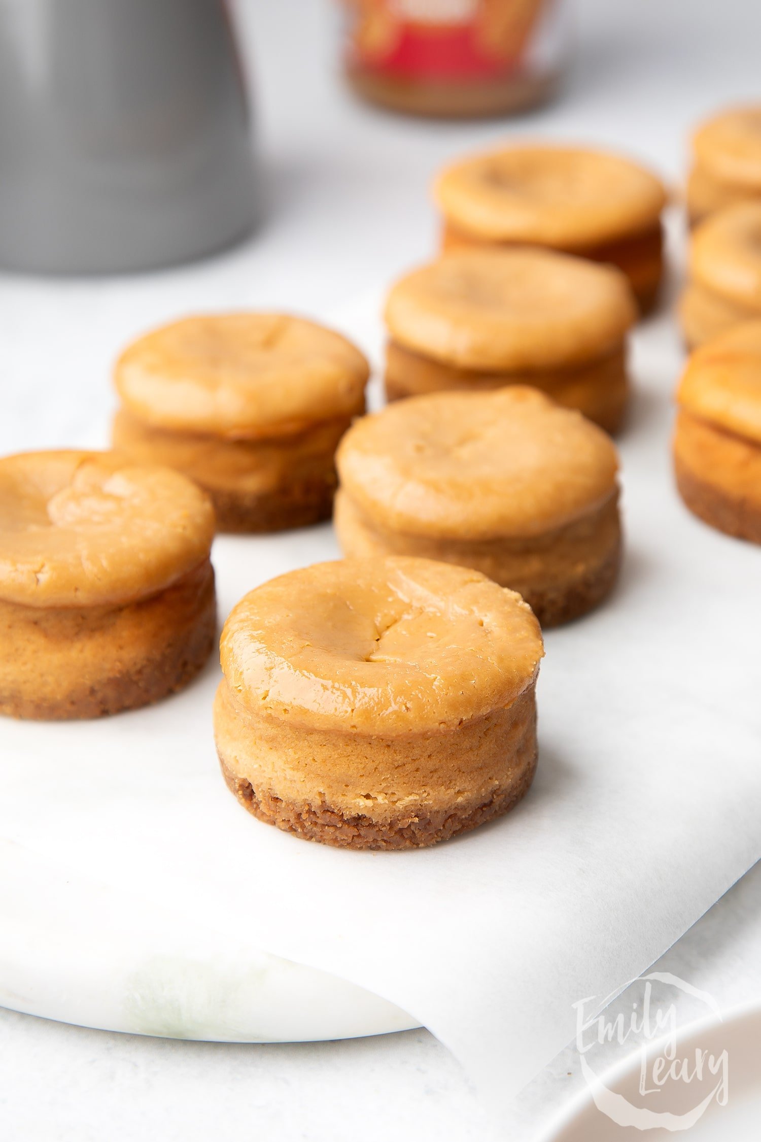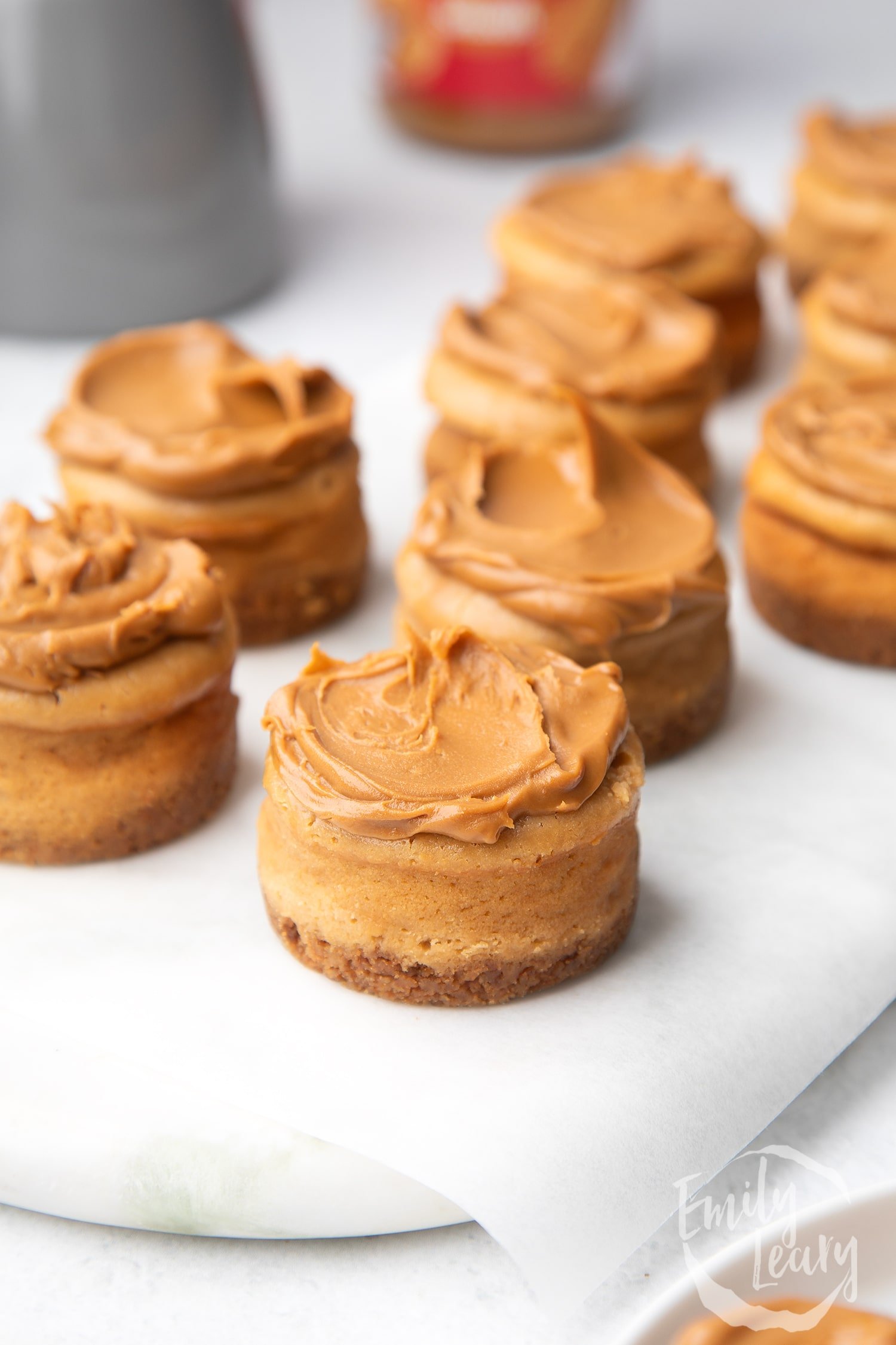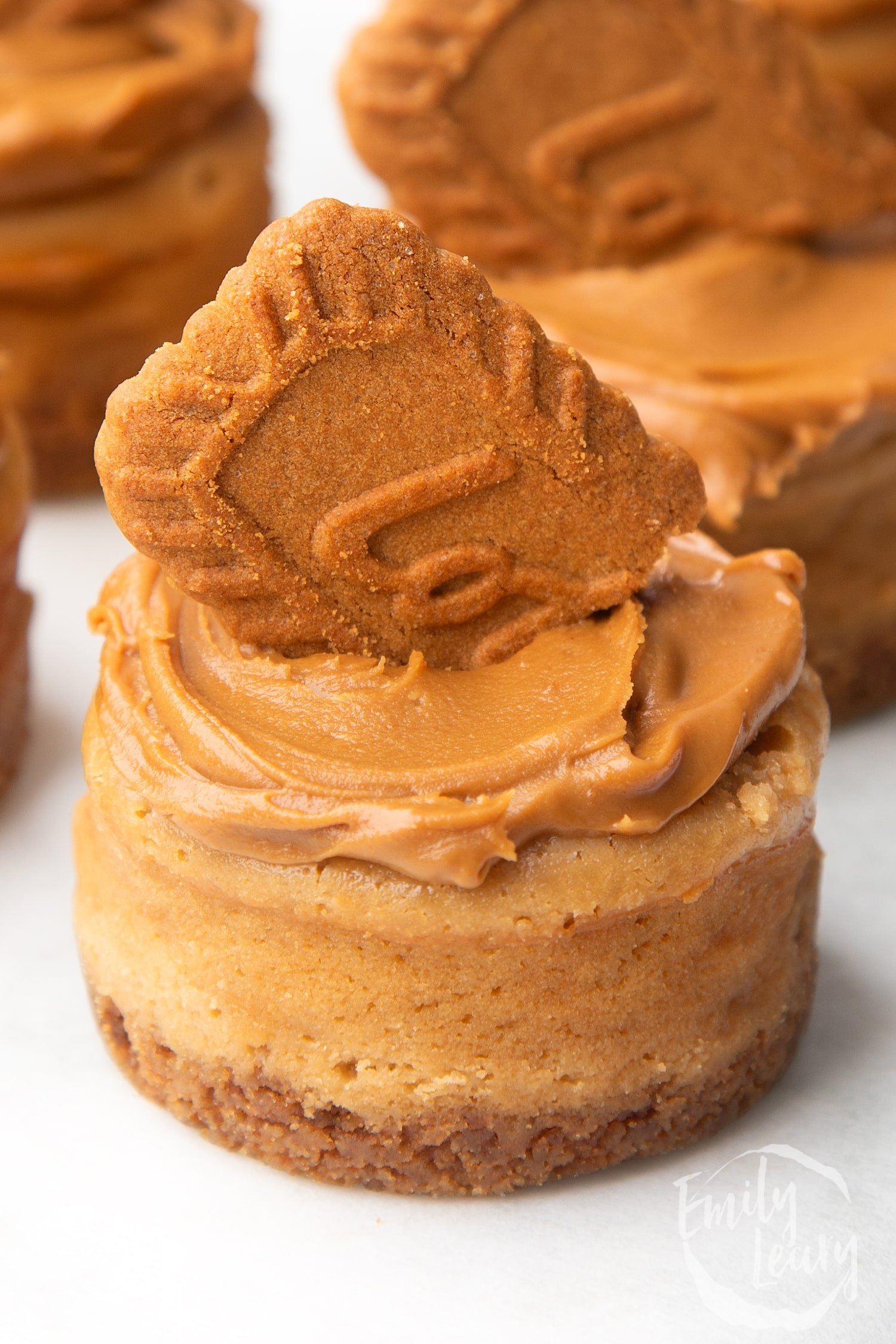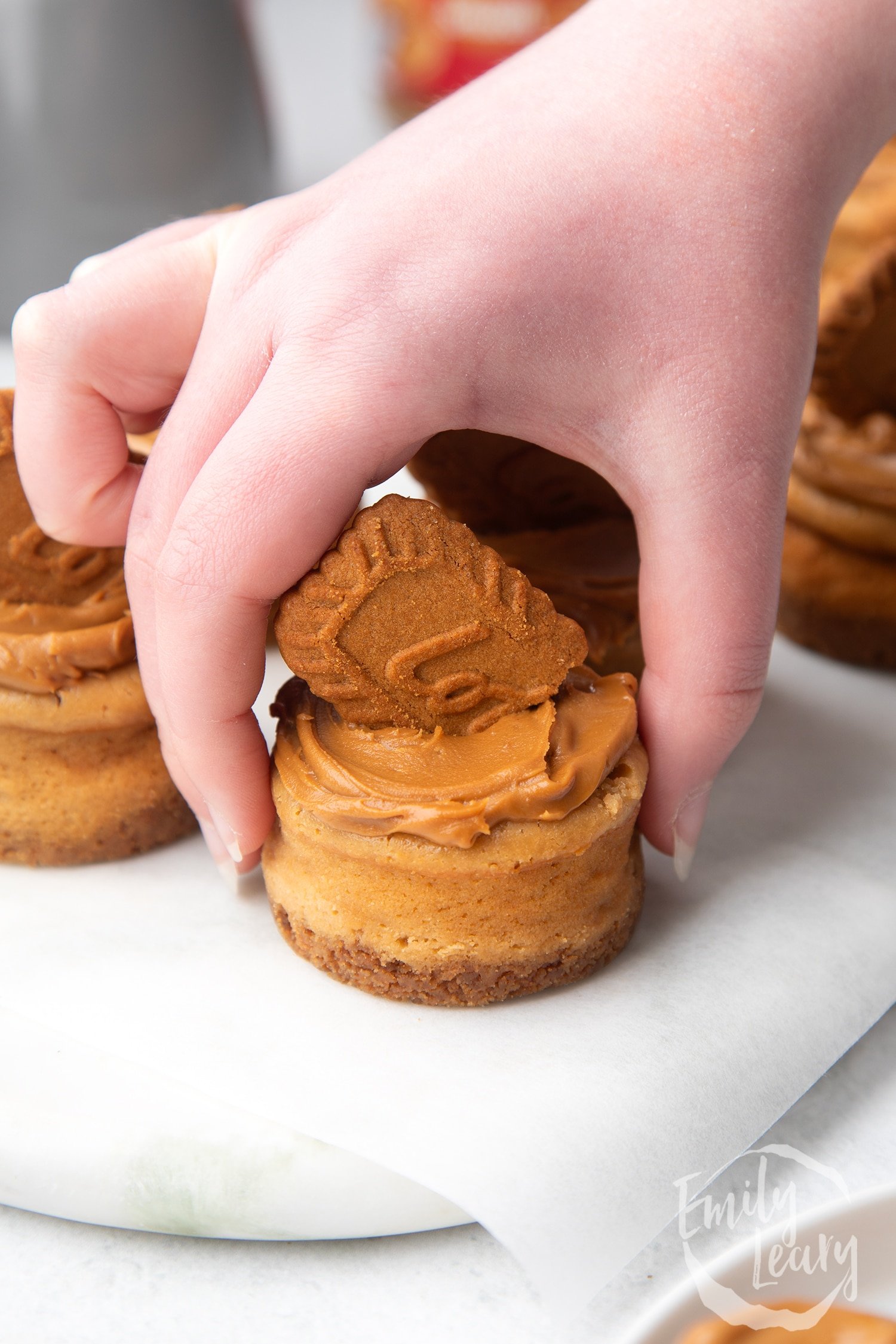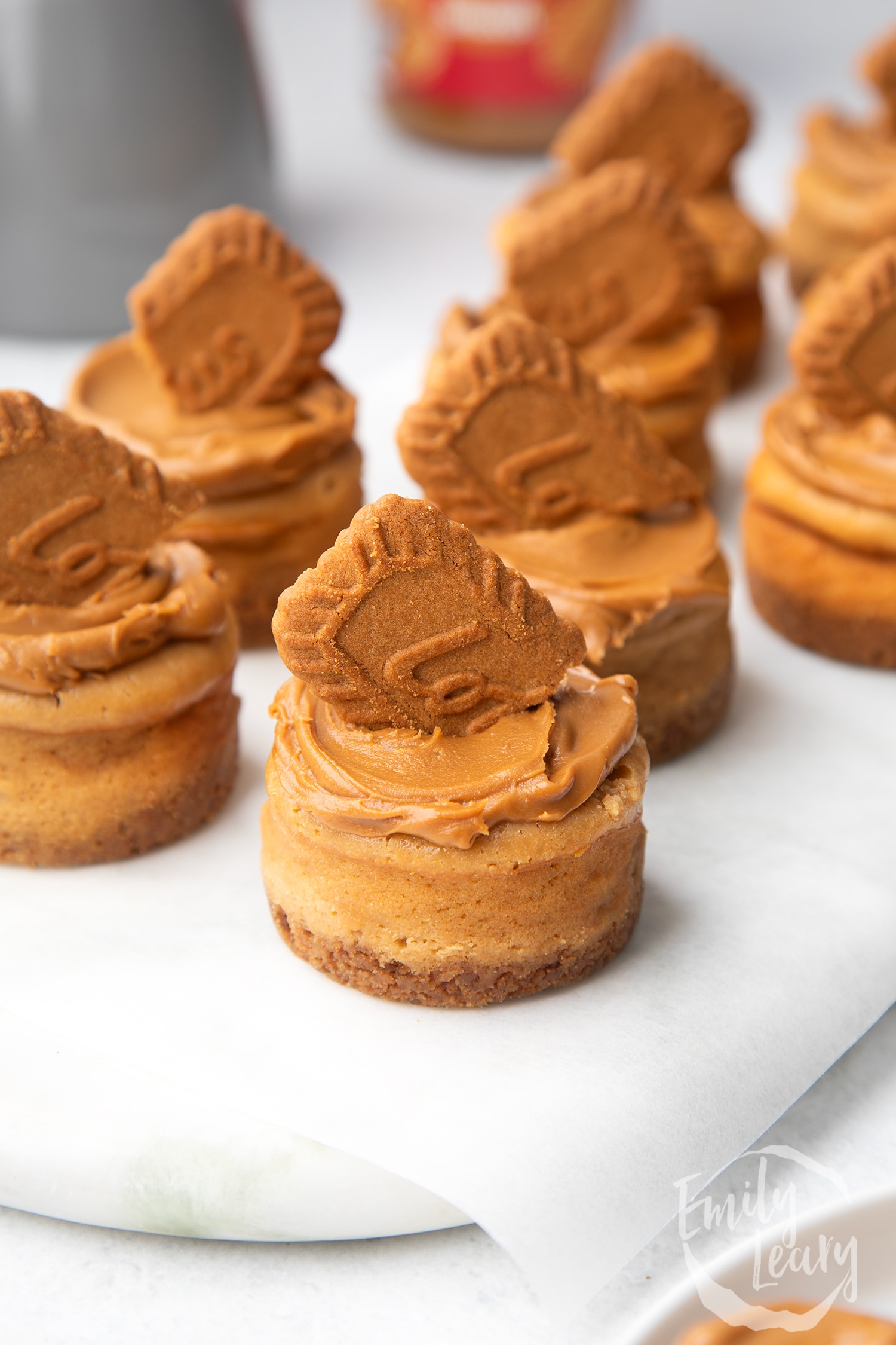 Once cool, each mini cheesecake is topped with a generous spoonful of warmed Biscoff spread, which melts across the surface before setting into a glossy layer.