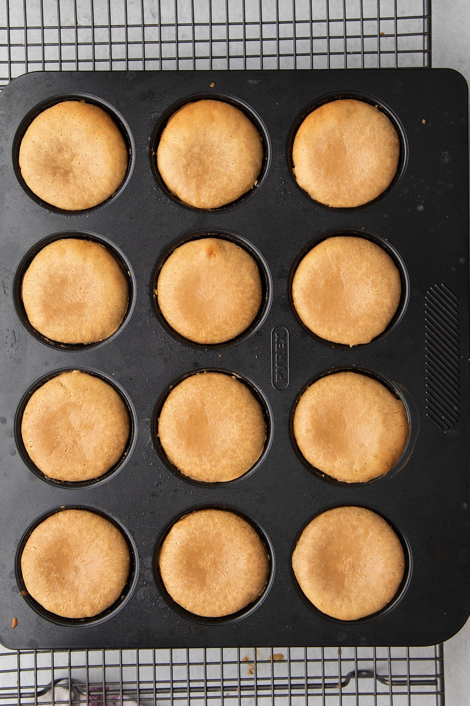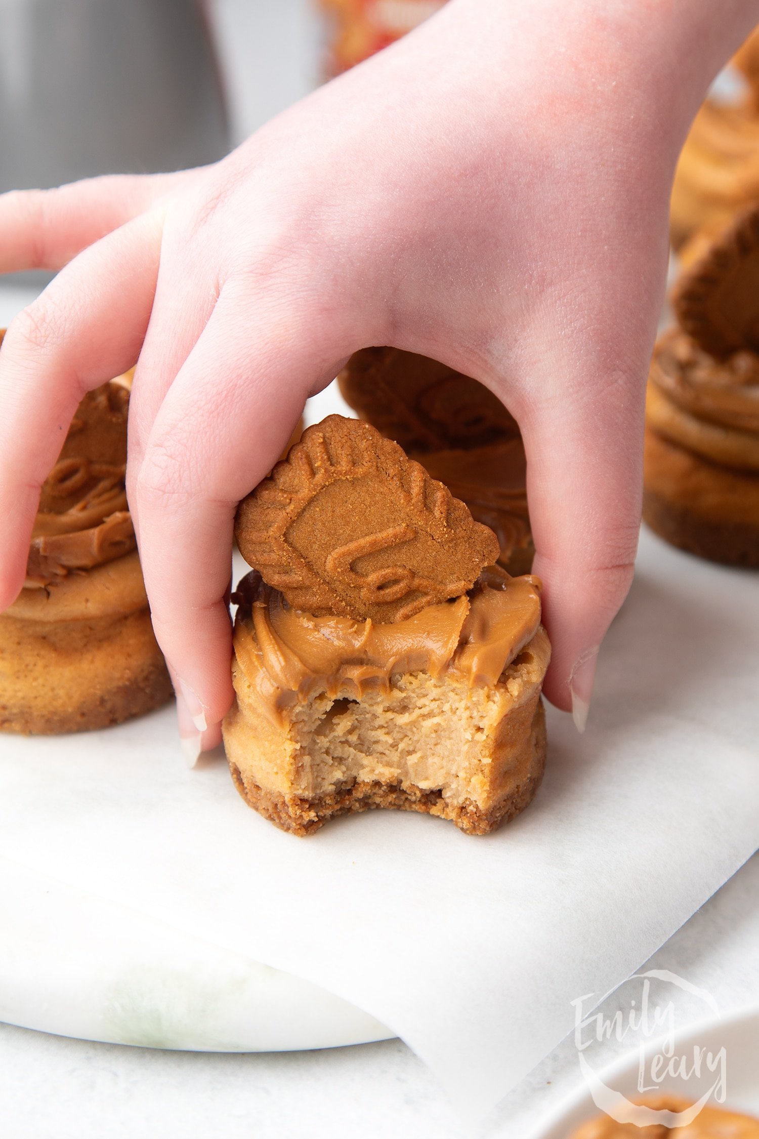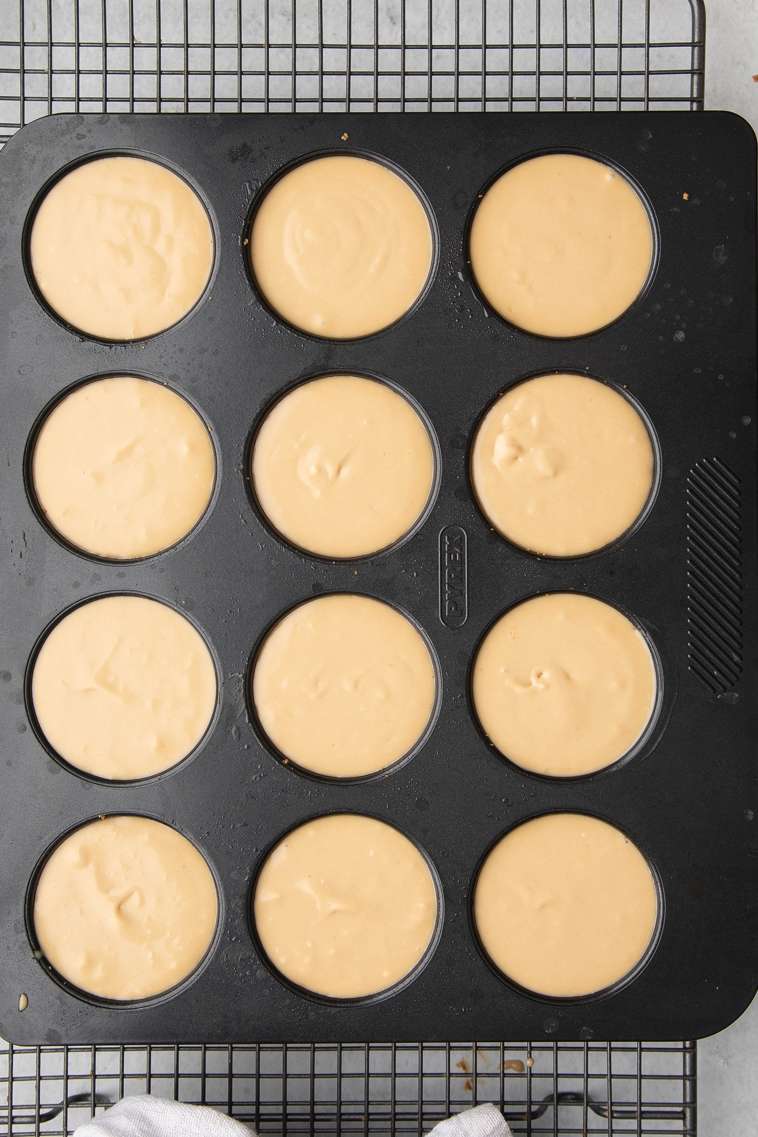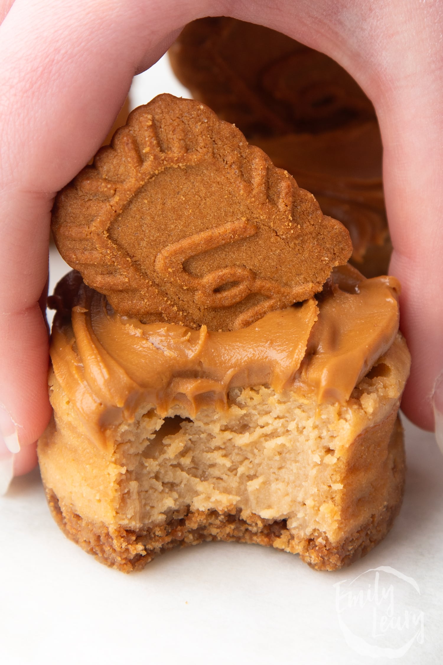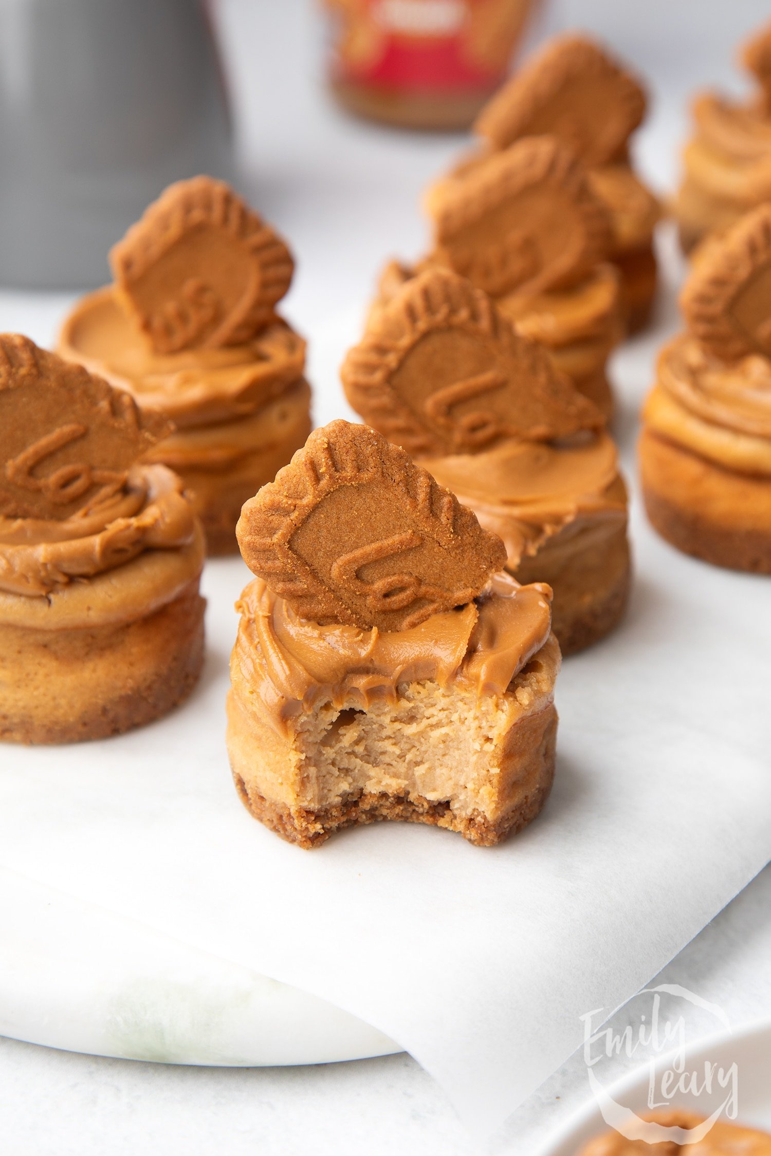 Once cool, each mini cheesecake is topped with a generous spoonful of warmed Biscoff spread, which melts across the surface before setting into a glossy layer.