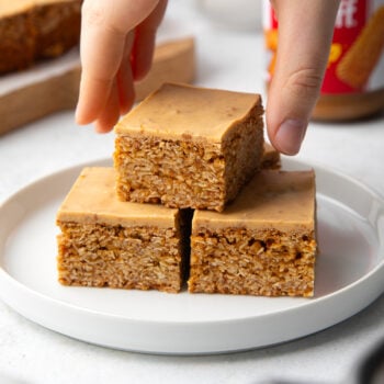 These oaty Biscoff flapjacks are buttery and golden, with crunchy Biscoff spread both stirred into the oats, and swirled into the thick, creamy white chocolate topping.