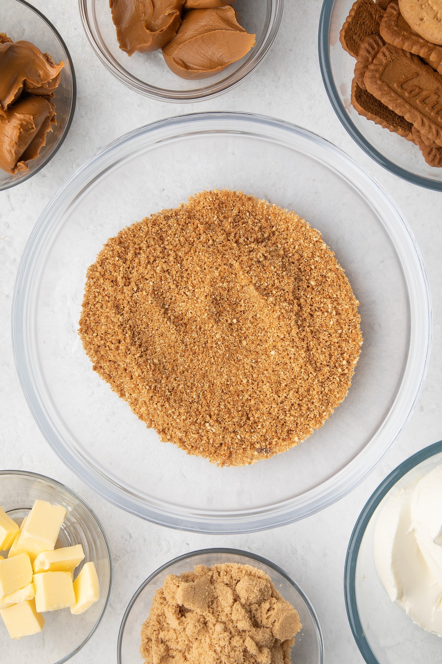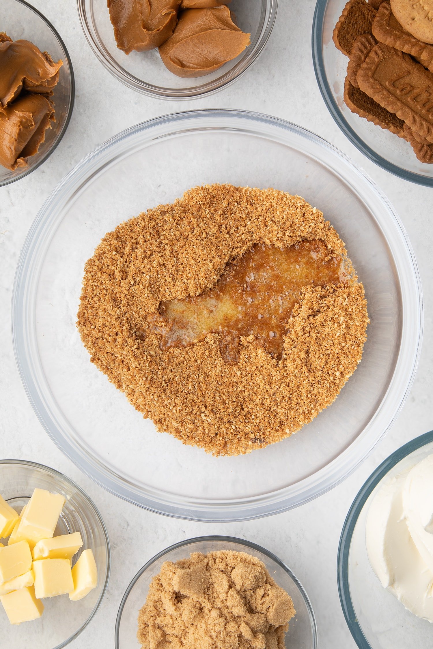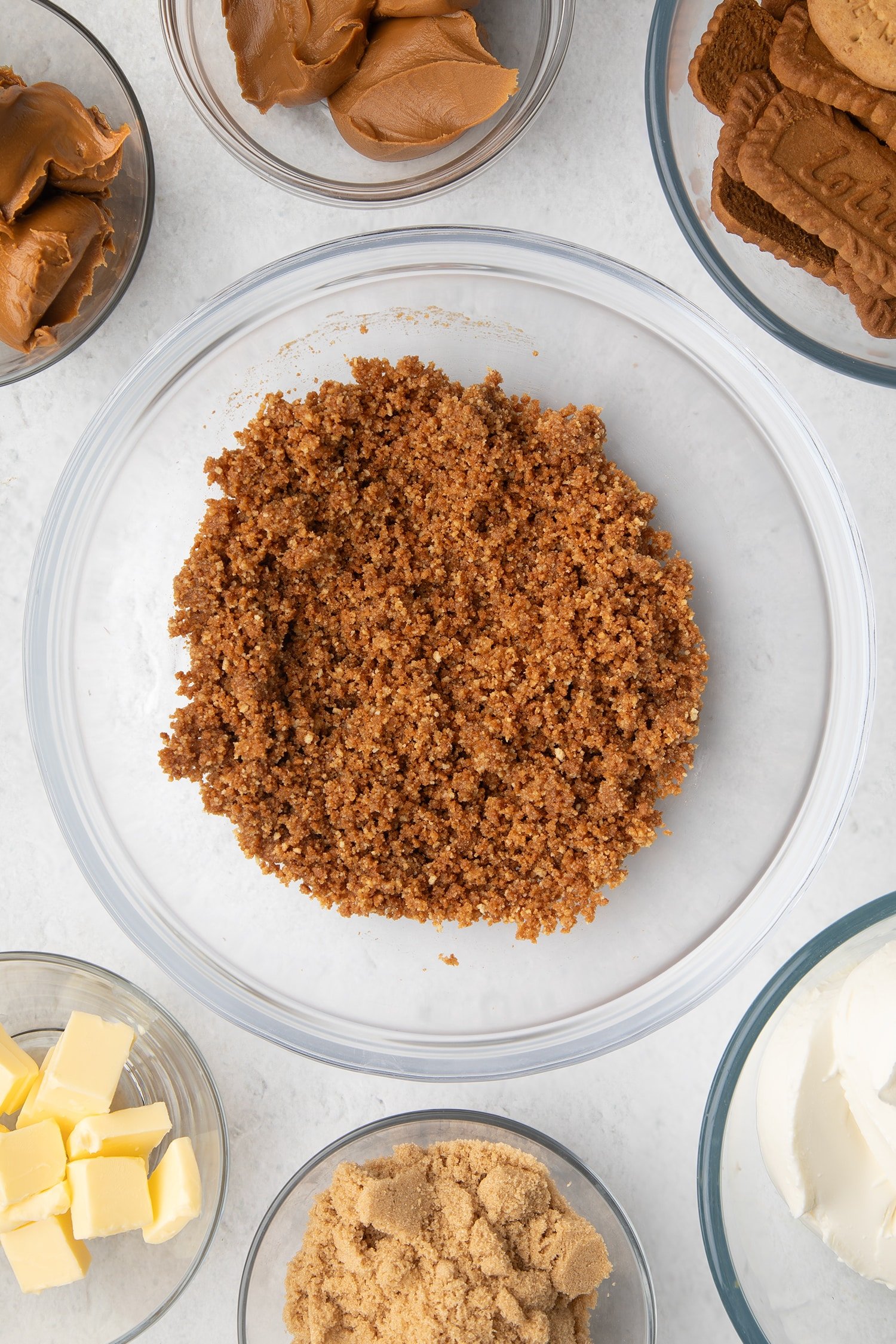 Crumble the digestive and Biscoff biscuits until sandy. This is quickest in a food processor, but you can also do it by popping them in a ziplock bag and bashing with a rolling pin.