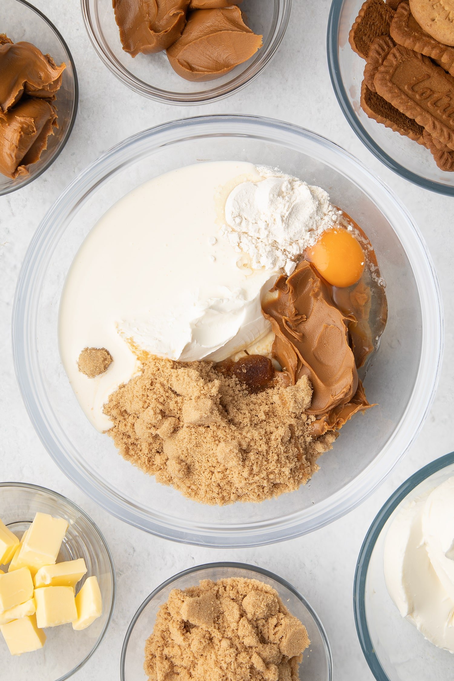 Put the cream cheese, cream, eggs, vanilla, sugar and Biscoff spread in a large bowl.