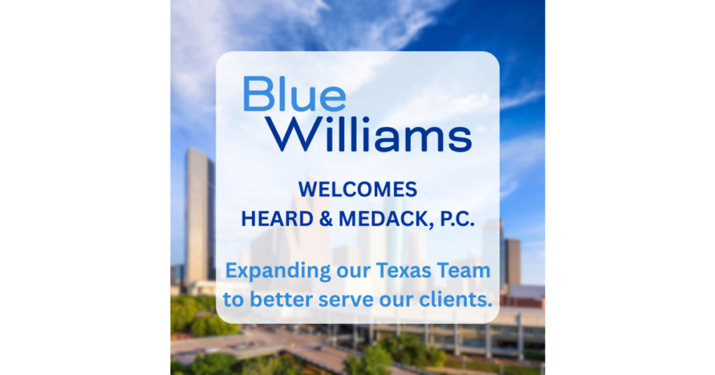 As part of the merger, the attorneys of Heard & Medack will join the Blue Williams Houston office, expanding the firm’s growing presence in Texas. The combination strengthens Blue Williams’ trial capabilities in the region and enhances the breadth of services available to clients throughout the state.