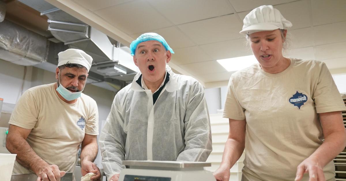 The pair were taught how to make the bakery’s flagship product – learning to knead dough, flatten the bread, and the process of cooking the pitta – as they raised concerns about the Governments’ policies towards small businesses.