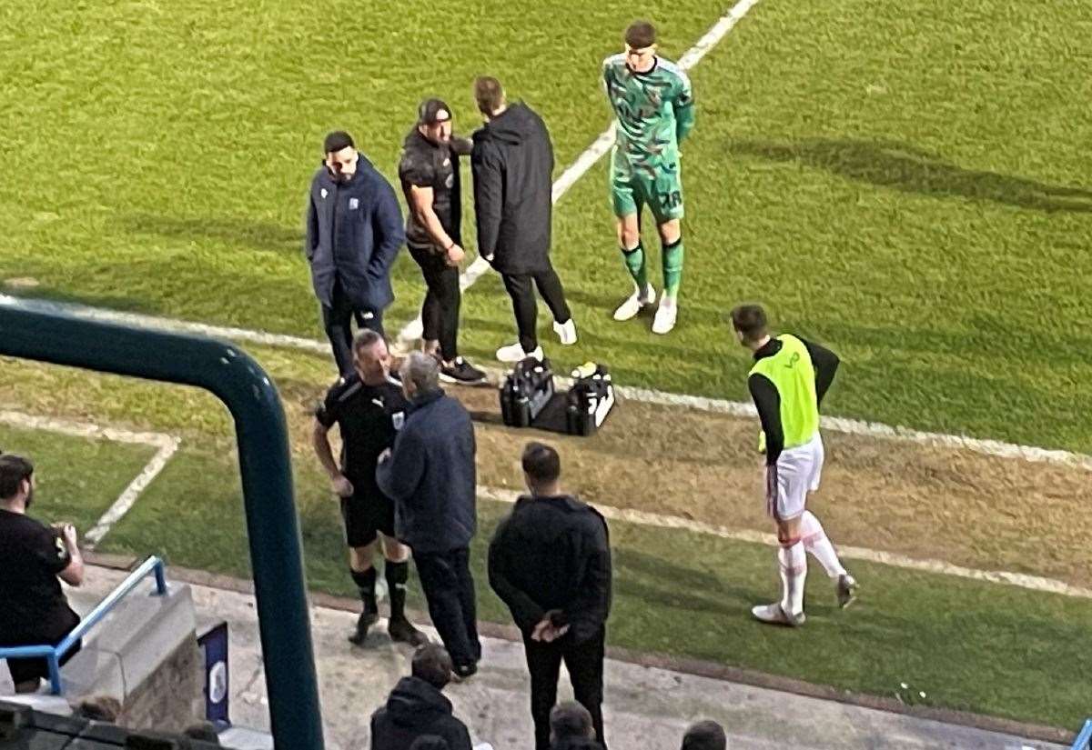 Referee Carl Brook paused the game just after the hour mark, and Gillingham’s PA announcer Doug Hudson appealed for someone in the crowd with a refereeing qualification to help out.