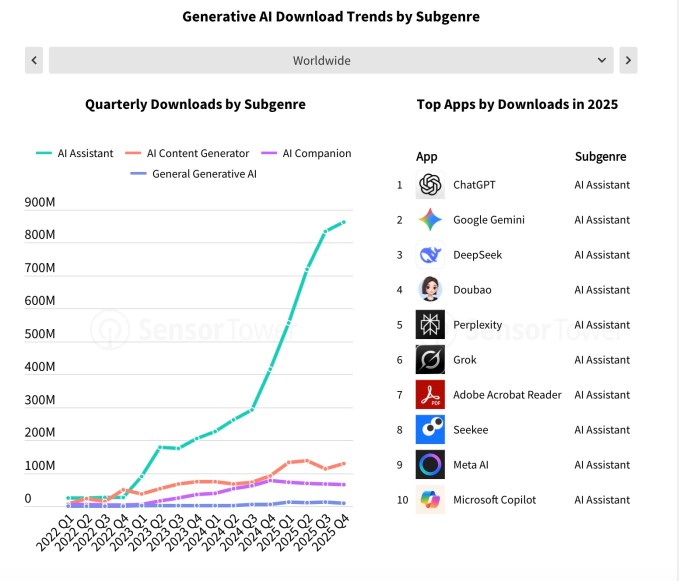 The report also highlighted the role that mobile plays in connecting users to generative AI services. Sensor Tower estimates that the total audience for AI assistants topped 200 million in the U.S. by year-end, and more than half (110M) were accessing the assistants exclusively on mobile devices. In 2024, for comparison, only around 13 million users were mobile-only.
