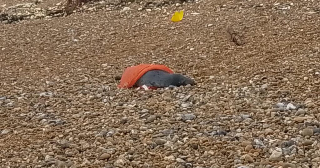 The lifeless creature was found this morning at Pevensey Bay, wrapped in an orange sack used to carry onions.
