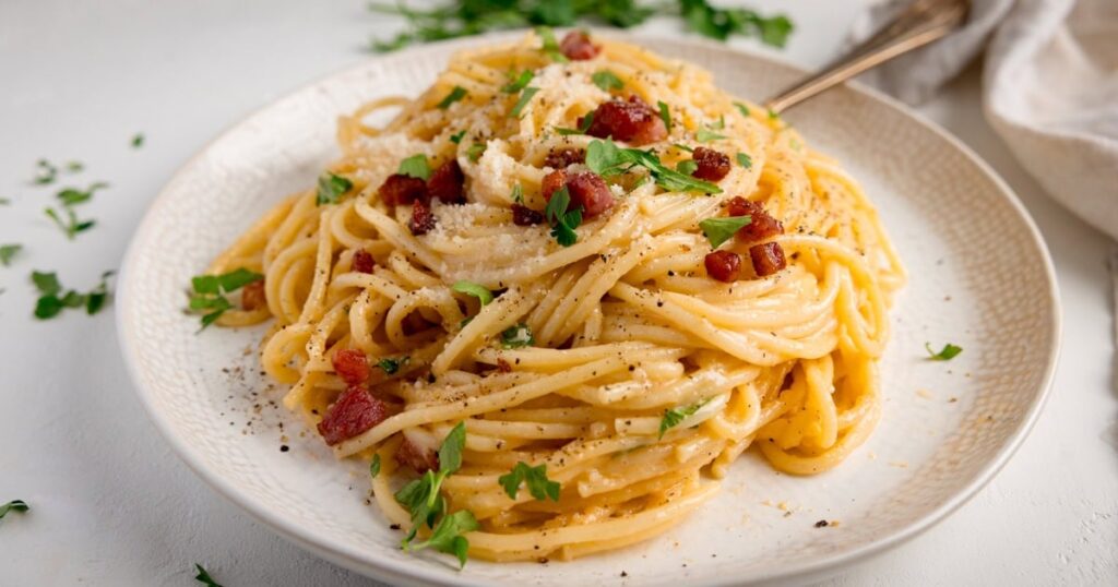 A classic carbonara doesn’t need cream in order to get that traditional creamy texture. The eggs, cheese, starchy pasta water and fat from cooking the pancetta are the magic ingredients for a rich, glossy, creamy sauce.
