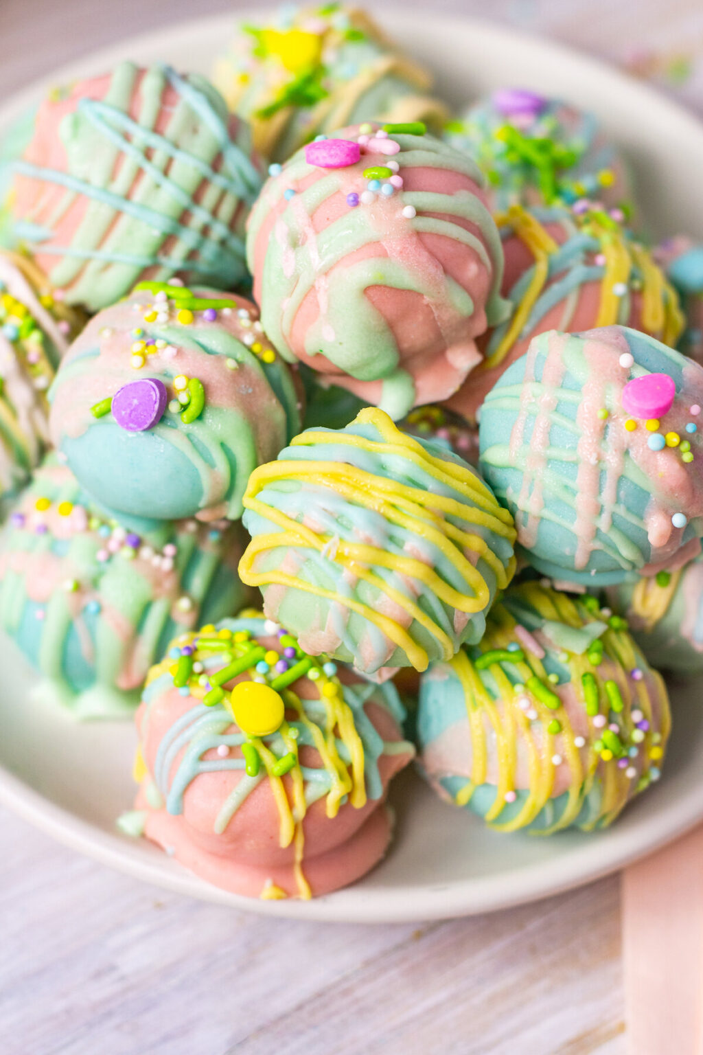 - Drizzle additional colors of melted candy coating over each truffle ball and top with sprinkles, if desired. Allow to set and harden, then serve