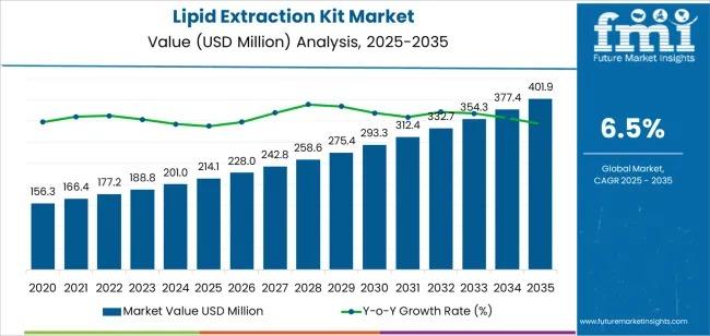 The Lipid Extraction Kit Market is forecast to experience robust growth, rising from USD 214.1 million in 2025 to USD 401.8 million by 2035 at a CAGR of 6.5%. This expansion is fueled by increasing lipid research, metabolomics programs, and modernization of analytical laboratories. Early adoption of solvent extraction kits, known for their reliable lipid recovery and workflow integration, will drive growth during 2025-2030, while specialized extraction formats, automation integration, and mass spectrometry compatibility will shape market dynamics in the latter half of the decade.