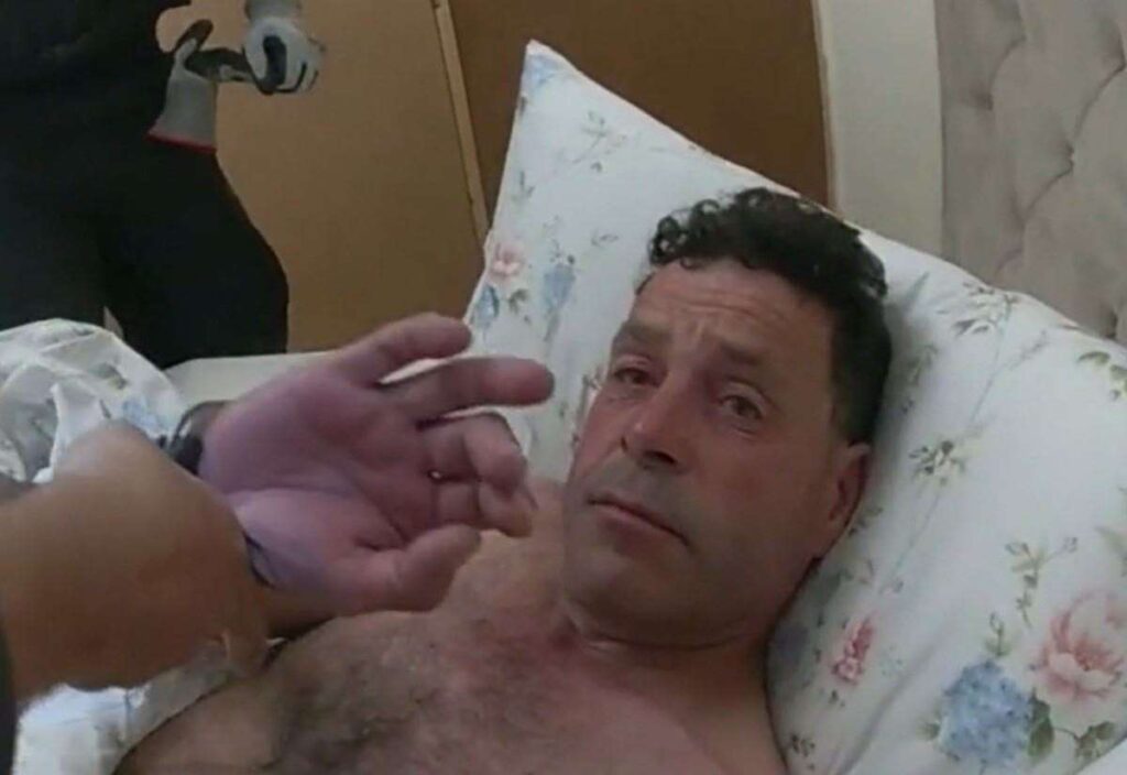Having forced entry, officers wearing body-worn cameras captured the moment they were greeted by the shirtless, heavily intoxicated 54-year-old under a floral duvet.