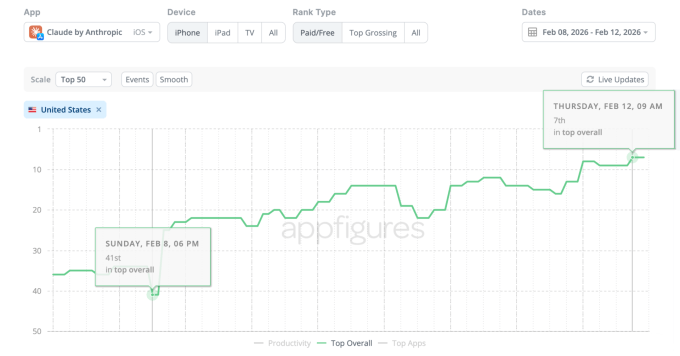 Anthropic’s Super Bowl ads — which feature darkly comedic scenarios of people seeking advice from chatbots, only to be steered to “cougar” dating sites and height-boosting insoles — have been paying off. In the days since, Anthropic’s AI chatbot Claude has climbed from No. 41 on the U.S. App Store to become a top 10 app. As of Friday, Claude sits at No. 7 — its highest rank to date — suggesting its “no ads” pitch resonates strongly with users.
