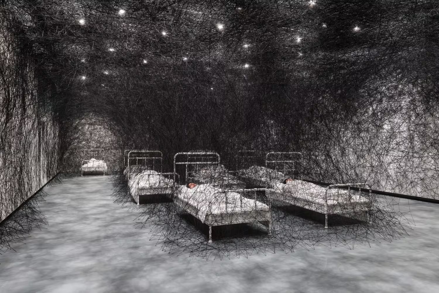 As you walk into one gallery in this new exhibition, a thick weave of string forms a kind of nightmare spiders’ web around a dozen institutional-looking beds. Once a month, these will be occupied by volunteers, bringing an element of performance to Chiharu Shiota’s installation. There’s a sense of child-like wonder as you navigate narrow corridors between the strands, the feeling of exploring someone else’s dream.