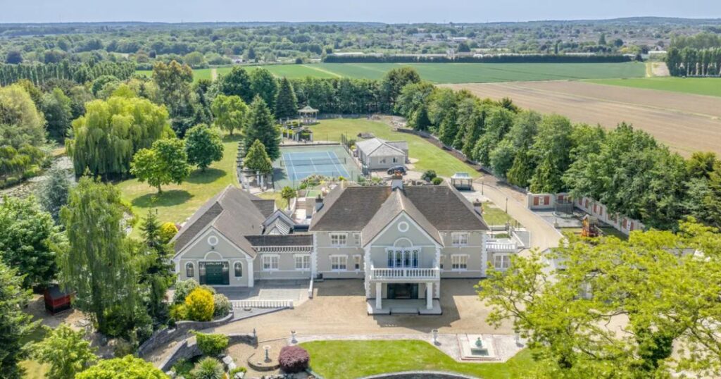The grounds feature a heated swimming pool, complete with a waterfall feature, a fully equipped outdoor kitchen, a private gym, and a floodlit tennis court.
