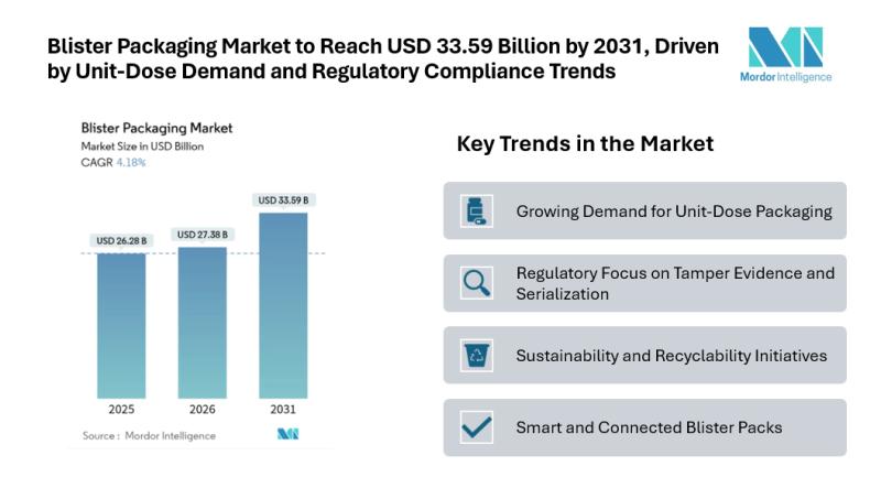 According to Mordor Intelligence, the blister packaging market was valued at USD 26.28 billion in 2025 and is estimated to grow from USD 27.38 billion in 2026 to reach USD 33.59 billion by 2031, registering a CAGR of 4.18% during the forecast period. The steady blister packaging market growth is supported by rising demand for prescription medicines, over-the-counter products, and complex biologics that require secure and tamper-evident packaging. This diversified demand base strengthens the blister packaging market share across multiple end-user segments and supports a stable blister packaging market forecast over the coming years.