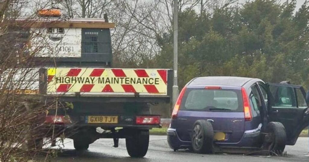 The back wheels of a car have fallen off blocking a busy roundabout before rush hour