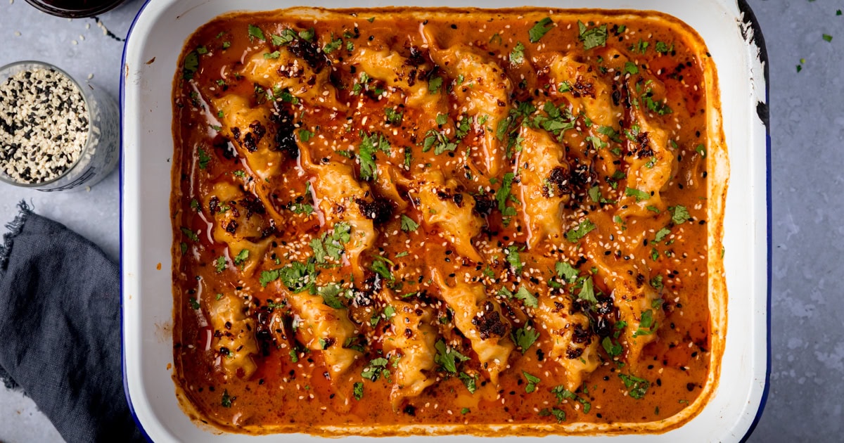 - Push th dumplings into the sauce slightly so the bottoms cook through, but keep the tops exposed, then spoon a little of the sauce over each of the gyoza. That contrast is what makes a dumpling bake properly addictive.