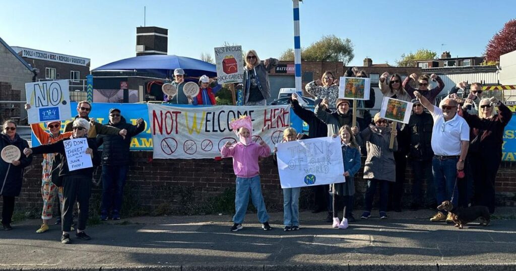 Children and adults held signs voicing their opposition to the plans, chanting “Hove against McDonald’s” and “burger off McDonald’s”, while some passing cars beeped in response.