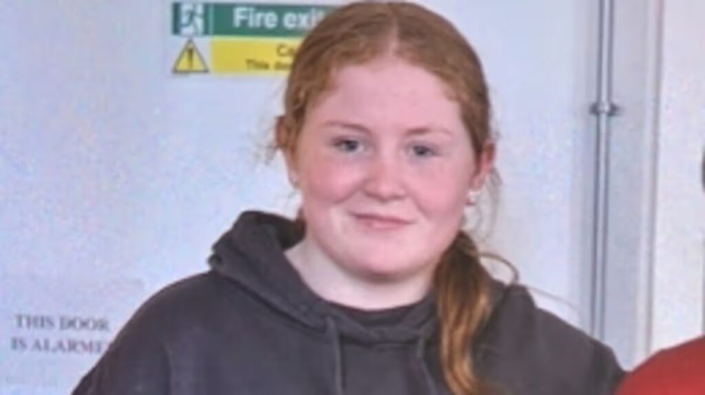 She is approximately 5ft 3’’, with long strawberry-blonde hair and blue eyes. She is wearing a school PE kit, consisting of blue jogging bottoms and a blue top, along with a green and black Nike bag.