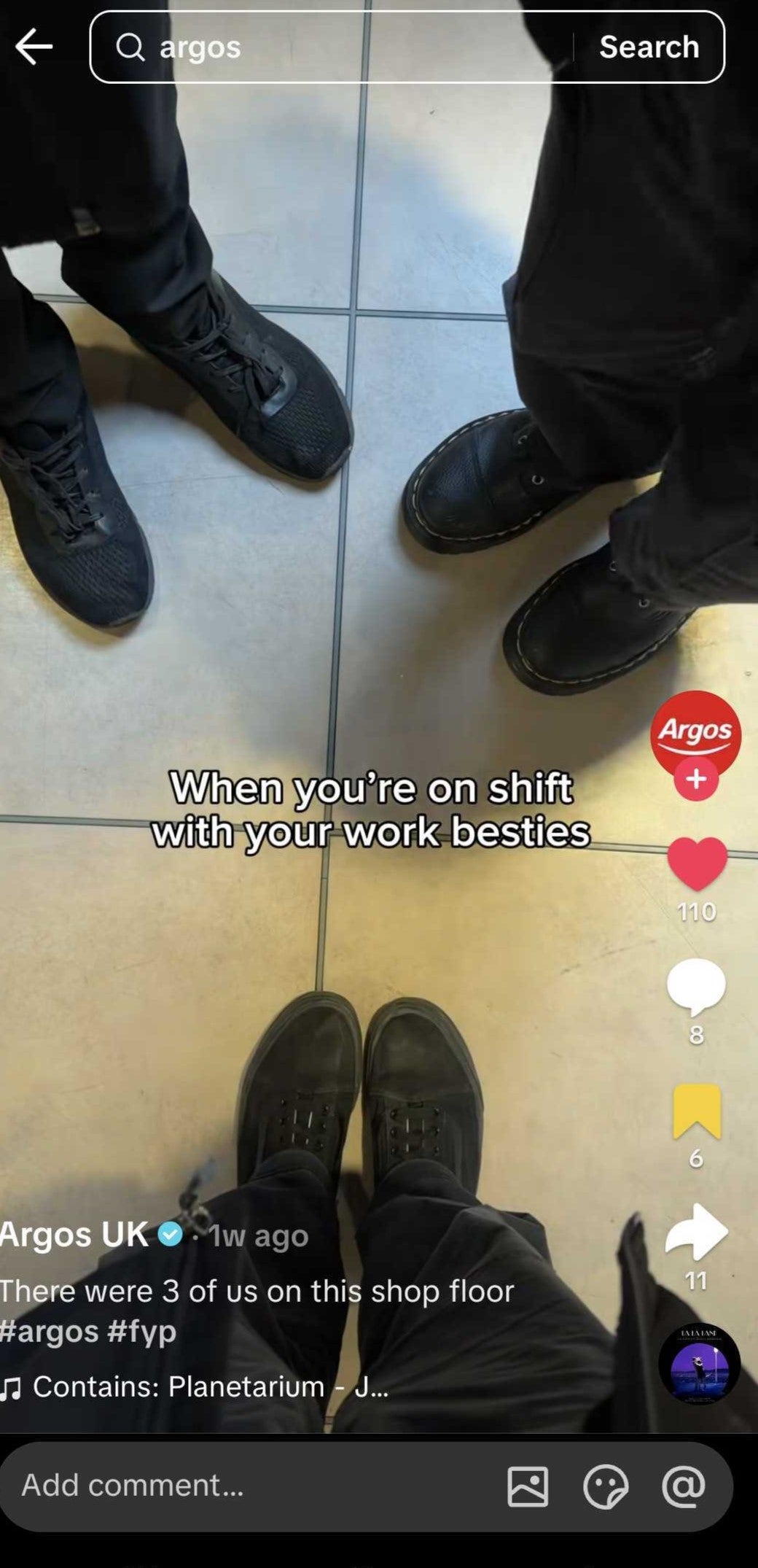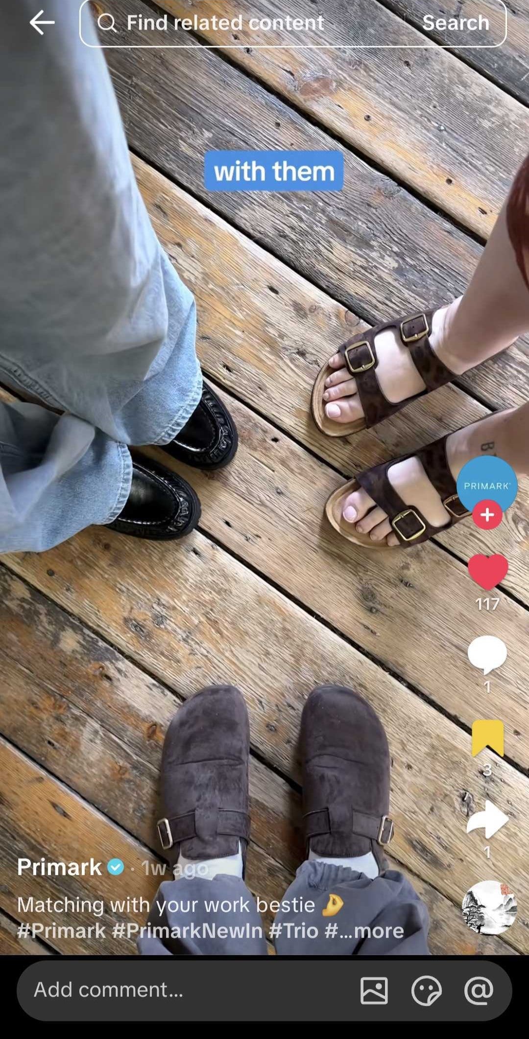 This trend opens with a simple shot of one person’s feet on the ground, soon joined by two others. It then cuts to a sequence of close-ups of three pairs of hands holding different items, such as pens, cups or tea, and items that are sold by the business.
